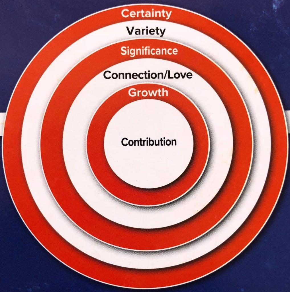 Contrairement à la « Pyramide » de Maslow, Tony Robbins ne classifie pas ces besoins par ordre de nécessité. Chaque besoin étant indépendant et à la fois connecté aux autres. La représentation la plus juste serait le symbole d’une cible avec en son centre le besoin de contribuer et de remonter ainsi la liste ci-dessus.