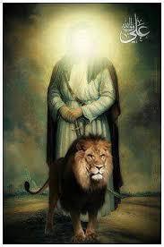 Représentation de l'Imam Ali accompagné d'un lion symbole de puissance