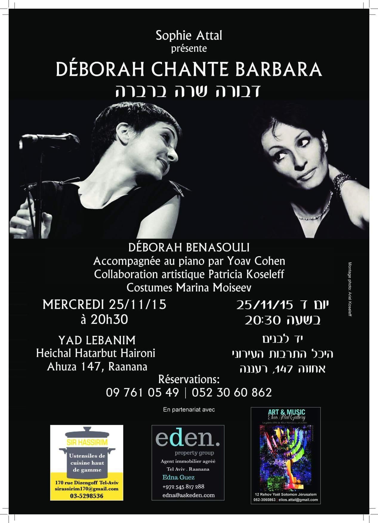 Le 23 juin dernier, Deborah montait sur scène à Jérusalem pour chanter Barbara. Plus de 300 personnes ont assisté à cet évènement unique en son genre. Le succès était au rendez-vous. « Une voix extraordinaire associée à une performance théâtrale grâce à une mise en scène remarquable », « Deborah interprète Barbara avec talent et réussit à faire chanter le public qui vibre à l'unisson », « Elle prend un plaisir fou sur scène et sait le partager », « Deborah fait jaillir la vie sur scène et nous fait tout oublier. Nous partons pour un voyage merveilleux grâce à ce spectacle ». Voilà quelques-unes des réactions suscitées par « Deborah chante Barbara ».