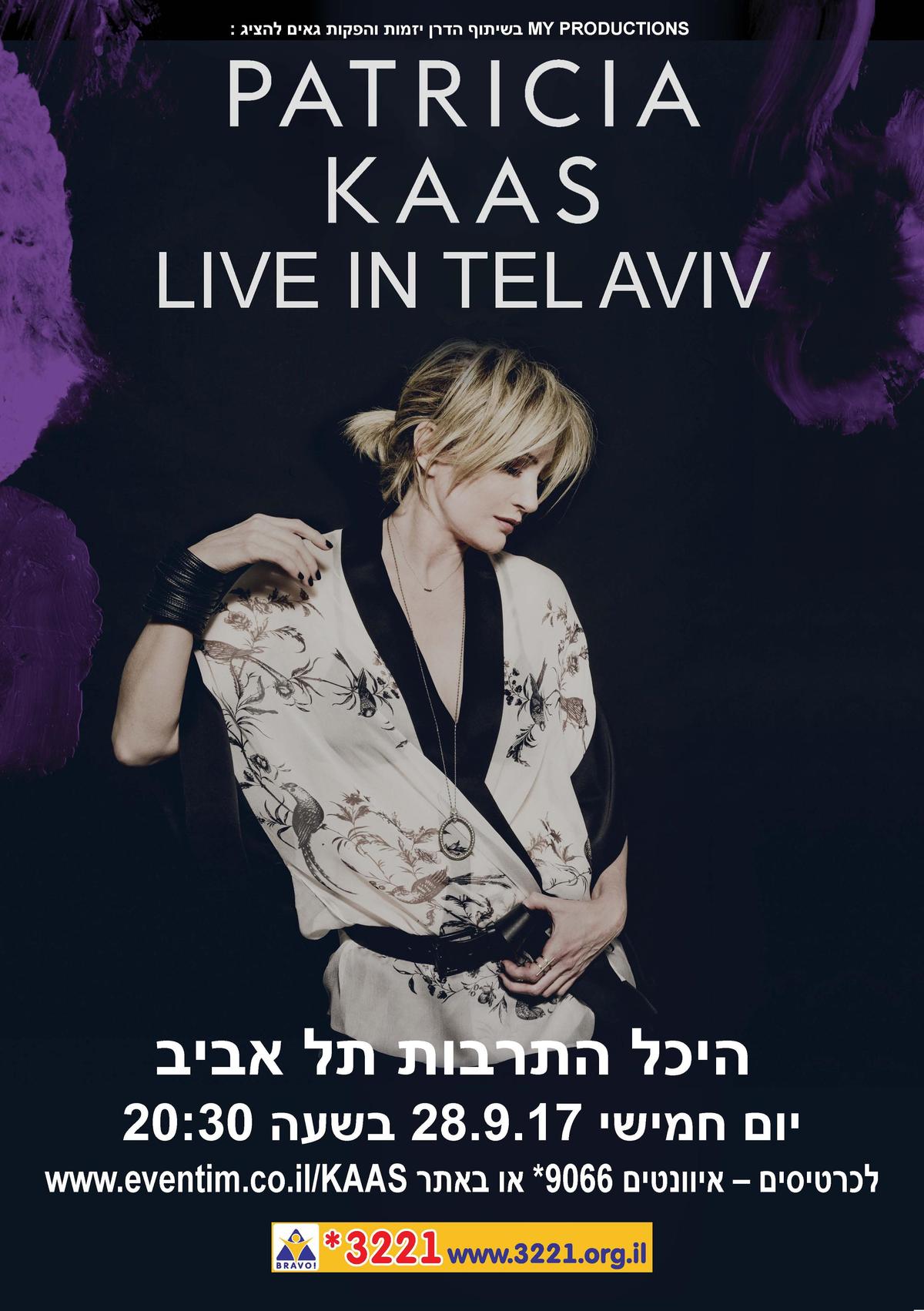 Patricia Kaas chantera à Tel Aviv le 28 Septembre 2017 pour un concert exceptionnel dans le cadre de sa tournée internationale. Cette tournée présente son nouvel album "Patricia Kaas", le 10ème album studio de la chanteuse en trente ans de carrière. Un album constitué exclusivement de compositions originales. Les albums de la chanteuse, dont les ventes sont estimées à 18 millions à travers le monde, sont commercialisés dans 47 pays, où elle se produit régulièrement sur scène.
