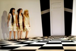 Dans un cadre en perspective aux portes surdimensionnées, dans un monde où tout est à hauteur de grandes personnes, les demoiselles tentent pourtant d'atteindre le monde des adultes et de remettre à plat un univers familial bancal. Robes dorées et chevelures interminables, les actrices scintillantes apportent fougue et vie à ce décor figé et trop carré. Orchestrée comme une véritable partition, la pièce se joue au rythme de la vivacité enfantine, aux sons des voix fluettes et criardes. Porté par les talentueuses comédiennes de cinéma, pleinement investies dans cette première aventure sur les planches, le spectacle s'offre comme une récréation pleine de création.
