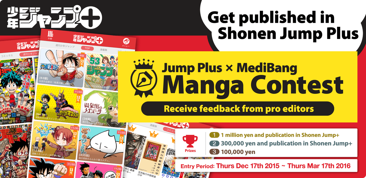 Le concours Jump Plus x Medibang est ouvert à tous, qu'importe l'âge, la nationalité, le niveau de compétence ou la langue. Jusqu'au 17 mars, les apprentis mangakas peuvent se connecter sur medibang.com pour proposer leurs travaux. La récompense ? Être publié sur la plateforme en ligne Shonen Jump Plus.