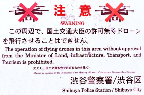 Et cette technologie devenant accessible et populaire, certaines municipalités ont déjà pris les devants pour assurer la sécurité de tous. Mal dirigé, un drone peut être dangereux en milieu urbain. Ainsi des panneaux ont vu le jour à Shibuya, près du fameux crossing, fantasme de tous les amateurs de drone au monde.