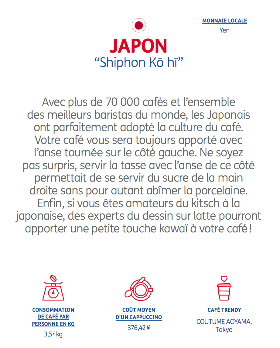 Le café est une véritable institution pour les Français mais est-ce le cas au Japon ? Les experts Travelex des quatre coins du monde ont travaillé avec Antoine Nétien, véritable passionné de café élu "Meilleur Torréfacteur de France 2011" pour dresser un aperçu des différents modes de consommation dans plus d'une vingtaine de pays.