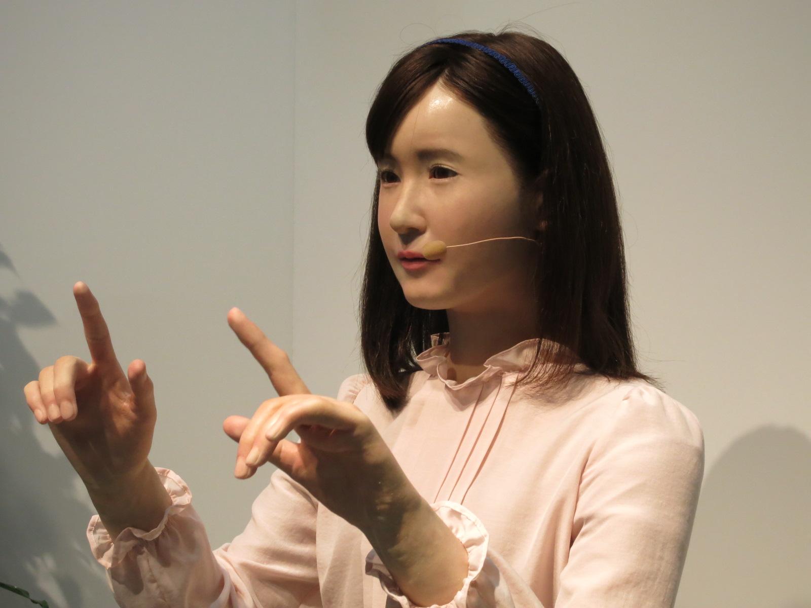 "Bonjour, je m'appelle Chihira Aico. J'ai 32 ans, même si techniquement je suis née en septembre 2014. Regardez comme je suis expressive !": la Japonaise de 1,65 mètre tout de rose vêtue sur le stand Toshiba parle, chante, s'exclame en levant les bras, cligne des yeux et sourit. Mais sa peau au grain hyperréaliste est en silicone, et elle cache des petits moteurs pneumatiques, dont 15 pour le seul visage. "Nous lui avons donné l'apparence d'un être humain, parce que la vraie communication passe aussi par les expressions faciales et les gestes", explique Taihei Yamaguchi, un responsable du groupe japonais. Le robot parle ici en anglais, mais devrait à terme maîtriser n'importe quelle langue, y compris celle des signes. Il n'est pas encore interactif (il fonctionne au CES avec un programme automatique) et ne peut pas encore se déplacer de manière autonome, mais ça viendra "dans un futur proche", assure Taihei Yamaguchi. "Un objectif, ce sont les jeux Olympiques" organisés à Tokyo en 2020, où Chihira Aico pourrait servir d'hôtesse d'accueil, mais "son objectif principal est de servir dans le secteur de la santé", indique-t-il. Dans sa démonstration, le robot lui-même envisage aussi de devenir "conseillère, présentatrice de journal télévisé ou pom-pom girl".