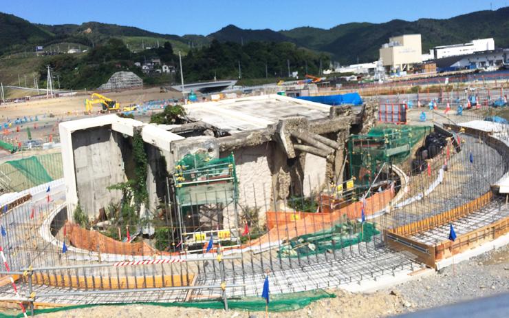 Nous avons ainsi pu nous rendre sur les lieux de la première étape située à Onagawa, petite bourgade située à 15 kilomètres de l'université. Aujourd'hui très calme, elle a pourtant connu l'enfer en ce jour du 11 mars 2011. Le poste de police balayé et totalement renversé a été laissé en place volontairement à quelques mètres du rivage pour en témoigner. Avec 827 personnes tuées, soit 8,26 % de sa population, et 4316 bâtiments détruits, soit les deux tiers de la ville, Onagawa possède le taux de dommages dus au grand séisme de 2011 le plus élevé de toutes les municipalités du Japon. Les photos prises après le passage de la vague montrent un véritable champ de bataille dans lequel rien n'a été épargné. Mais depuis la catastrophe, la ville a su se relever pour montrer un visage des plus charmants. Et des plus neufs parce qu'il a fallu tout reconstruire. Grâce à son maire en place depuis 8 ans, Monsieur Yoshiaki Suda, et sa grande motivation pour le projet de Reconstruction, la nouvelle Onagawa a pu se construire Un chantier énorme a pris place sur les restes de la ville et a façonné un nouveau paysage. Les flancs de trois montagnes alentours ont dû être partiellement coupées et le terrain surélevé de plusieurs mètres pour garantir une meilleure sécurité à l'avenir. En 2015, une nouvelle gare et un centre commercial ont ainsi été ouverts, montrant ainsi le visage du Renouveau toujours tourné vers l'avenir. Chose unique, les concepteurs du projet sont allés jusqu'à orienter dans un angle précis la rue principale de cette zone commerciale afin que le premier lever du soleil de l'année, qui a une symbolique toute particulière pour les Japonais, soit exactement dans son axe au-dessus de l'océan. Il nous a expliqué que, si un quart de la population avait quitté les lieux au lendemain de la catastrophe, les autres, surtout les jeunes, avaient accepté le challenge avec fierté. Tout le monde a retrouvé ici une maison et les aides à la reconstruction ont bien fonctionné. Reste à attirer de nouvelles entreprises pour permettre à l'économie de la ville et de la région de se relever complètement.