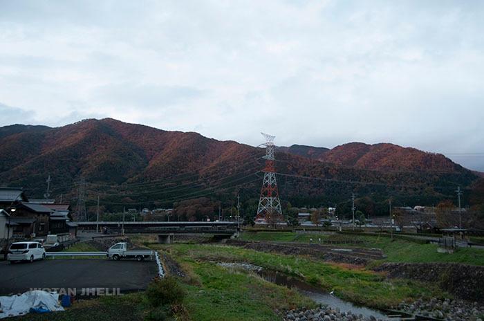 Le soir tombe et les oiseaux se réunissent le long des câbles pour passer la nuit sereinement. Dans une station-service, je relève curieusement la présence d’un énorme drapeau sudiste états-unien derrière la vitre, plus pour se revendiquer d’un imaginaire routier déjà bien rodé que par réelle conviction politique. Les collines passent du vert au rouge tandis que j’approche d’un panneau : « 300 m, Momiji Festival, Eigenji ».