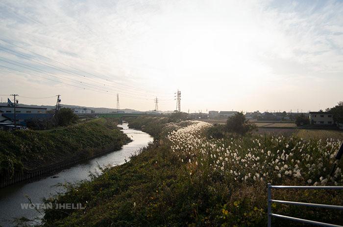 Une importante campagne de protection écologique fut d’ailleurs entreprise depuis les années soixante-dix pour rendre au dragon ferré une partie de sa superbe et protéger sa riche biodiversité. Mais actuellement c’est un fleuve en décrue presque à sec que je pourrais traverser à pied en choisissant bien mon parcours. Un sentier de promenade arpente la lande d’herbes et de bosquets brunis le long de la digue de pierres, s’étendant par endroits sur d’étroites langues de sable et de galets amoncelés par les courants en de petites dunes sur lesquelles la végétation pousse timidement, profitant de ces coins isolés de soleil jusqu’à la prochaine montée des eaux. Masqué par un fin voile de nuages bleu-gris tombant sur l’horizon, l’amont de la rivière se cache parmi les montagnes, par-delà la zone industrielle de la cité d’Hamamatsu.