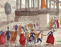 La fête de la Fédération du 14 juillet 1790 fut le point d'orgue d'une multitude d'initiatives spontanées sur tout le territoire français. Dès le mois d'août 1789, les fédérations sont apparues dans les communes et les provinces. Mais ce n'est que le 5 juin 1790 que l'Assemblée Nationale approuve la proposition de la Commune de Paris d'organiser "une Fédération générale". Elle est organisée très tardivement, et donc largement improvisée. C'est surtout, montée avec enthousiasme des profondeurs du pays, une aspiration à une unité nouvelle et un appel à un cadre stable. La manifestation a lieu sur le Champ de Mars, profondément transformé par les Parisiens eux-mêmes, épisode connu sous le nom de "journée des brouettes". Il est bordé pour l'occasion par deux monticules de terre, élevés pour accueillir 400.000 spectateurs. La célébration débute dès 4 heures du matin, sous une pluie battante qui durera toute la journée (le "Journal de Paris"prévoyait des "averses fréquentes"...). Après les célébrations officielles, la journée se poursuit, dans les jardins de la Muette, par un banquet de 22.000 couverts, qui ouvre la fête populaire. On se retrouve sur les ruines de la Bastille pour danser, boire et chanter. On porte des toasts, et l'organisation prévoit jusqu'au "tarif des filles du Palais Royal"...