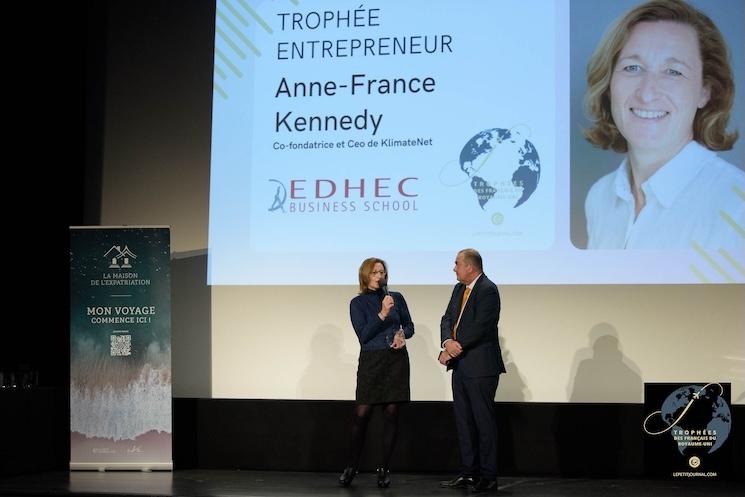 Le Trophée Entrepreneur, sponsorisé par EDHEC Business School, a récompensé Anne France Kennedy et son application Klimatenet. Il a été remis par Camille Vanseymortier, Marketing & Promotions Manager à EDHEC Business School. « L’idée de KlimateNet est simple : si les gens peuvent se rencontrer sur une application pour des raisons sentimentales, pourquoi nous ne pourrions pas faire une application pour faire rencontrer des gens sur des solutions climatiques ? », a expliqué l’entrepreneuse, cofondatrice de ce « LinkedIn des enjeux climatiques ».