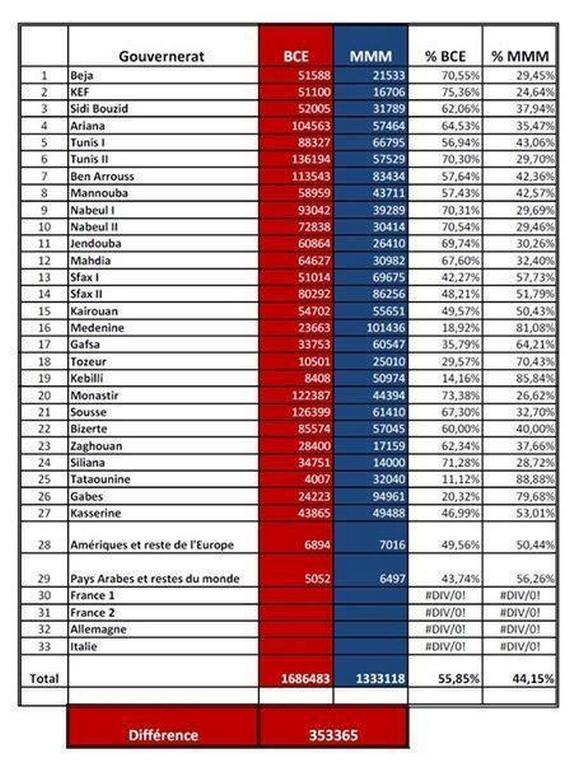 L'institut de sondage SIGMA annonçait 55,5 % pour Beji Caïd Essebsi, alors que 3C donne 53,8 % et 52,8 % pour Emrohd.