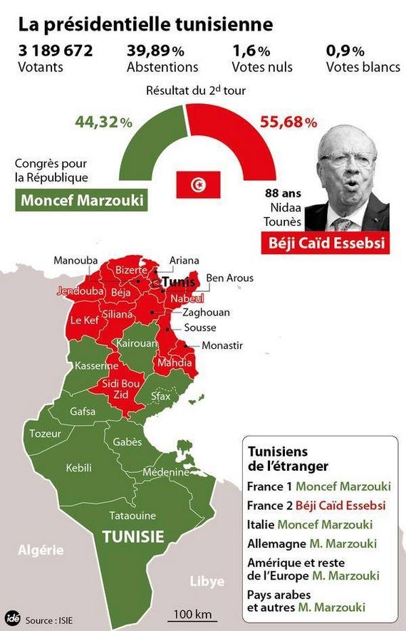 Au premier tour, Béji Caïd Essebsi, l'ex-ministre de Bourguiba était arrivé en tête du premier tour avec 39,46% des suffrages contre 33,43% en faveur de son challenger, Moncef Marzouki.