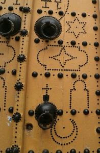 Nous commençons par une très belle porte jaune, très symbolique de la tolérance tunisienne : en effet, le double battant entièrement clouté comporte les signes des trois religions monothéistes : le croissant, la croix, l'étoile de David.