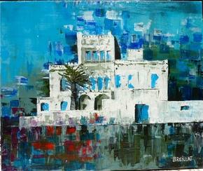 Mon travail actuel consiste à célébrer l'architecture des quartiers que je connais, La Marsa, Carthage,La Goulette...etc, leurs belles maisons du début XXème, le blanc éclatant des façades, le turquoise qui domine ici et là, couleur typique du coin. Je travaille également sur les portraits, passionnants et compliqués à réaliser au couteau.