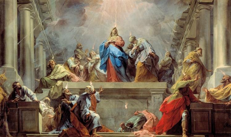 Dans la Bible, les Actes des Apôtres racontent comment les disciples, encore tout émus de la mort de Jésus et de ses diverses apparitions, étaient réunis ensemble dans un lieu appelé Cénacle. Après avoir entendu un bruit étonnant, ils virent apparaître des langues de feu qui se posèrent sur chacun d'eux. Emplis de l'Esprit saint, ils se mirent à parler dans toutes les langues, et se sentirent soudain investis d'une nouvelle mission, celle de répandre la Bonne Nouvelle de la résurrection de Jésus.