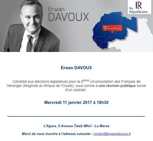 Erwan Davoux est chargé de mission des Républicains pour la 9e circonscription : Maghreb et Afrique de l'ouest. Il est également candidat aux élections législatives pour la 9ème circonscription des Français de l'Etranger. Nous l'avons rencontré à La Marsa où il donnera une réunion publique, à l'Agora, le 11 janvier à 18h30