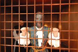Il y fut conduit le 24 août 1669 escorté par d'Artagnan et ses fameux mousquetaires, affublé d'un curieux masque (un drap en velours noir renforcé par des lanières de métal). Nul n'était au courant du motif de sa détention et son identité n'était connue que de son geôlier, Bénigne de Saint-Mars, seul homme autorisé à l'approcher et à lui parler.