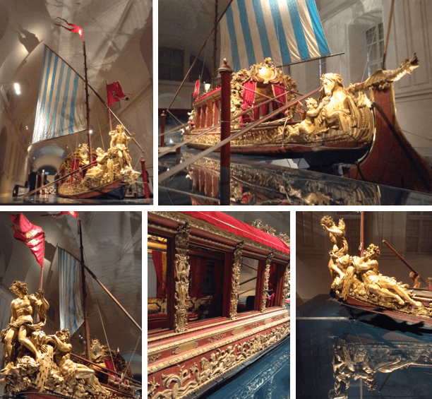 Richement décoré de stucs et de velours, c'était le bateau d'apparat de la Maison de Savoie. Aujourd'hui le Bucentaure est mis en valeur par une nouvelle scénographie signée par l'architecte Gianfranco Gritella dans les Ecuries royales de la Venaria