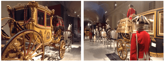 La vaste salle d'exposition des Ecuries royales accueille également quatre carrosses utilisés par la Maison de Savoie aux XVIIIe et XIXe siècles. A la fin du parcours, une vidéo permet de parcourir les étapes principales de l'histoire de la dynastie à partir de 1562 jusqu'à la fin de la Première Guerre mondiale.