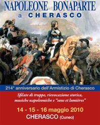 Pour Cherasco, c'est l'occasion de mettre en valeur le patrimoine historique de la ville tout en rappelant le rôle joué par l'armistice dans les équilibres précaires de l'échiquier européen de l'époque : en occupant la partie sud-ouest du Piémont, la République Française créait une diversion pour poursuivre la guerre contre les ennemis de la Révolution, les Autrichiens cette fois-ci. L'édition 2010 est plus longue que les précédentes : elle s'étale sur trois jours, du 14 au 16 mai 2010. A noter, pour la deuxième année consécutive, le spectacle Sons et lumières qui aura lieu sur la place de l'Arco Belvedere samedi 15 de 22h à minuit et qui évoquera la première campagne d'Italie et la vie de napoléon Bonaparte sur fond de musiques révolutionnaires. Avis aux amateurs, un atelier de BD de l'Empire sera même organisé dans une école de la ville.