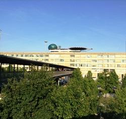 L'ancienne usine Fiat du Lingotto à Turin surmontée de l'héliport et de la "bolla", la bulle, salle de réunion de Fiat sur le toit du Lingotto