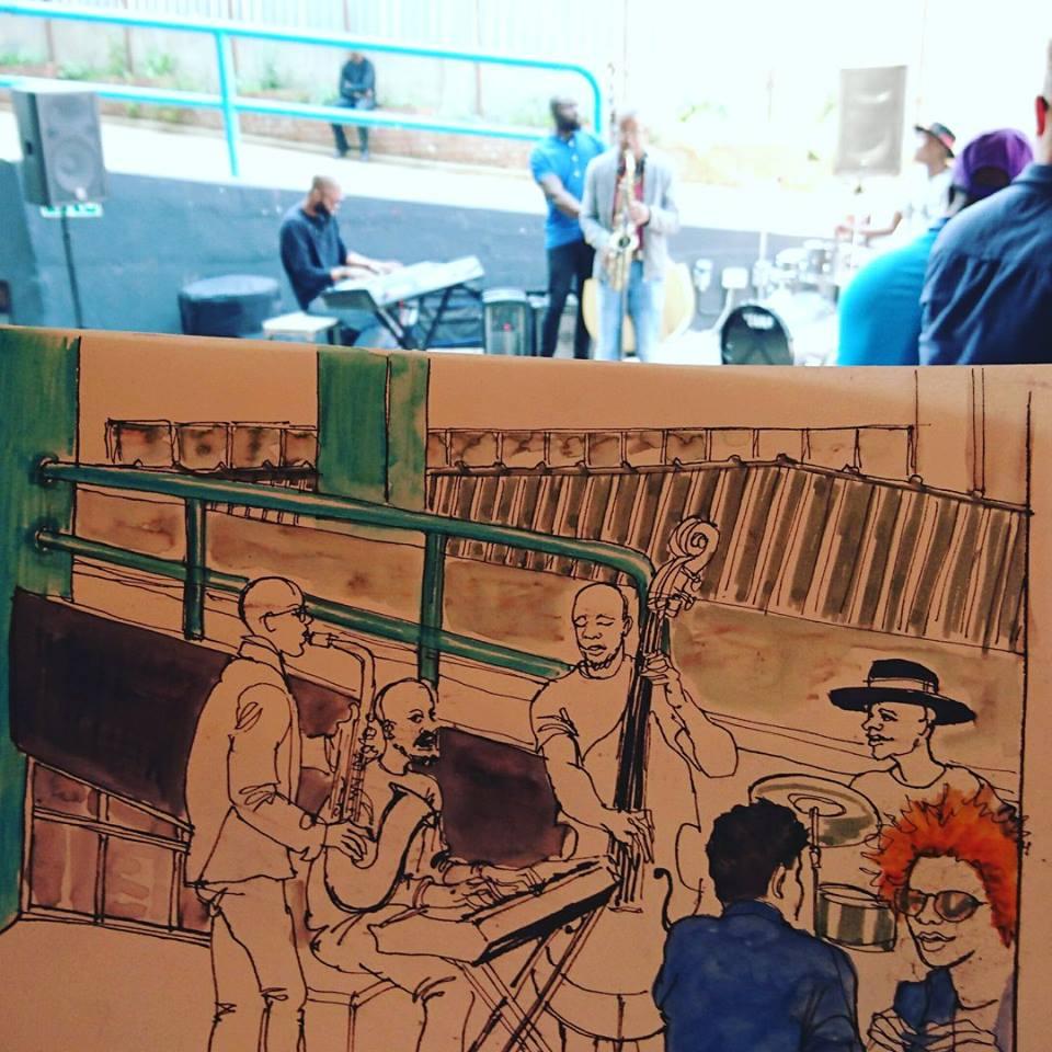 Nous avons commencé nos croquis dans le « food hall » avec les musiciens, le gâteau et les ballons, puis nous nous sommes ensuite arrêté au Zombie Chefs pour le déjeuner. Avec sa grande peinture murale en fond, ce lieu pourrait occuper un artiste pendant des mois, je ne doute pas que nous serons de retour bientôt !