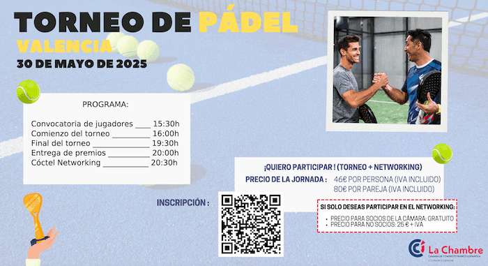 Le 30 mai 2025, Valencia accueillera un événement unique alliant sport, networking et moments de détente : le tournoi de padel de la Chambre de commerce franco-espagnole. Organisé dans les installations ultramodernes de Sporcity, à Massanassa – le deuxième plus grand club de padel au monde –, ce rendez-vous promet une expérience à la croisée de la compétition et du monde des affaires !