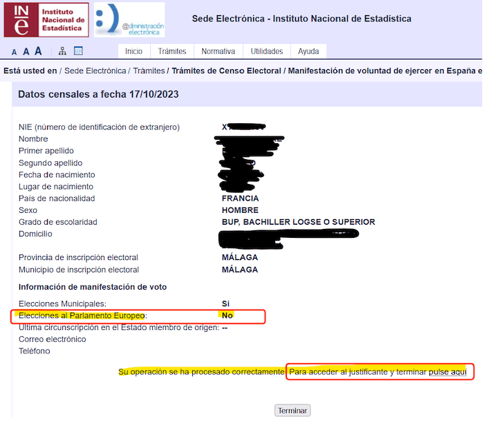 5. Confirmation : Après validation, une page de confirmation apparaît dans laquelle le choix pour voter aux élections européennes pour une liste espagnole est passé à « NO ». Vous pouvez obtenir immédiatement un justificatif de votre situation électorale.