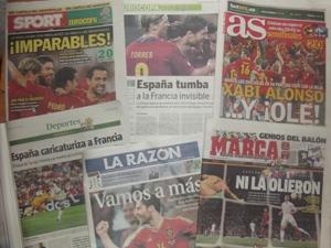 De l'absentéisme de haut niveau, aux confins de la magie, concernant certains. Un désintérêt flagrant pour d'autres, une impuissance criante pour tous. N'en jetez plus : les Bleus n'étaient ni au rendez-vous ni au niveau. Pour le plus grand bonheur de la presse espagnole, qui n'a pas laissé passer l'opportunité -historique, donc, puisque l'Espagne n'avait jamais battu la France en match officiel- de savourer sa revanche. Acide, comme toujours, et juste comme jamais. Jugez plutôt : "L'Espagne soumet totalement une France en carton" et "L'Espagne prend la Bastille" (ABC), "Ils ne l'ont même pas senti passer" et "Des coqs sans tête" (Marca), "La France passe à la guillotine" (Sport), "L'Espagne caricature la France" (La Vanguardia, en référence aux Guignols de l'info), "L'Espagne renverse une France invisible" (La Razón), "Au revoir Francia..." (La Gaceta), "Au lait se prononce 'Olé' " (Estadio deportivo), et de nombreux autres titres du style s'affichaient hier en grand sur les Unes des quotidiens espagnols. Zinédine Zidane a eu le flair gagnant de célébrer ses 40 ans en Provence, ce qui lui aura éviter de lire le condensé de frustration accumulée débité par certains médias espagnols, avec humour ou pas. Le journaliste Paul Tenorio, dans La Gaceta, exprimait hier son immense fierté : "Aucune génération d'Espagnols n'avait vu son équipe battre les Guignols en match officiel. Maintenant, les marionnettes peuvent bien dire que nos sportifs se dopent ! Qu'ils se moquent des leurs, ils l'ont facile ! Cela fait très exactement 198 ans, depuis le 10 avril 1814 et la fin de la guerre d'indépendance, que l'on attendait ce moment de pouvoir ridiculiser à nouveau les "Gabachos" ! "