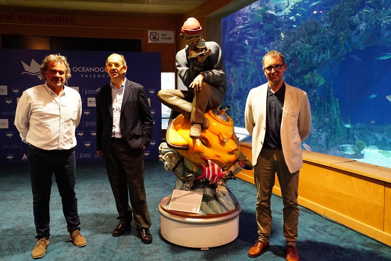 Juan Antonio Romero, Directeur du Festival, et Eduardo Nogués, Directeur Général de l'Oceanogràfic (à gauche) découvre le Ninot Indultat présenté par Gil Manuel-Hernandez, Directeur du Museo Fallero de Valence