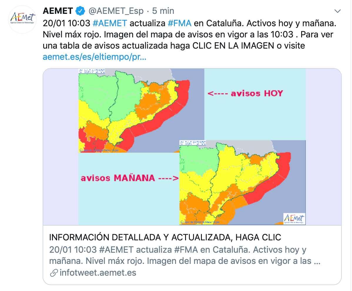 L'alerte rouge a été déclenchée en Catalogne pour les journées de lundi 20 et mardi 21 janvier. Les autorités recommandent d’éviter tout déplacement à proximité du littoral et de ne pas s’aventurer sur les plages et les jetées. Selon l'Agence météorologique espagnole (Aemet), le vent d’Est devrait continuer de souffler en rafales, à plus de 120 km/h, et générer des vagues allant jusqu’à sept mètres de haut. Un risque d’inondations élevé en raison de fortes pluies est aussi annoncé sur le territoire Catalan.