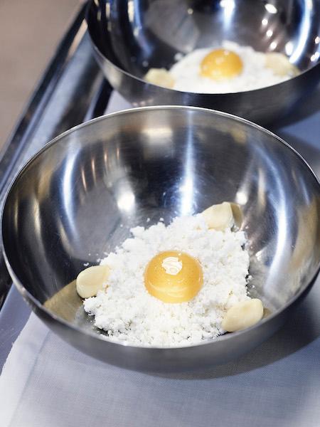 Nous avons une brioche, avec des ingrédients aromatiques, des levures, des fruits secs, le tout disposé dans un bol comme si le plat était en pleine préparation, mais le désert est en réalité fini. Nous donnons la même importance au salé qu' au sucré.