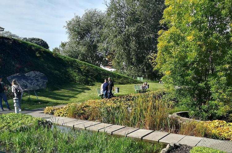 Le tout est aménagé de petites passerelles, de ruisseaux et chemins fleuris. C’est une vie végétale et animale riche, avec un étang, des chênes et des spirées du Japon qui fleurissent en plein été. Les jardins offrent également une vue magnifique sur la partie basse de Varsovie, le fleuve, le Centre Copernic des Sciences et la rive droite de la ville. Un endroit magnifique, hors du temps et romantique, idéal pour respirer ou cultiver l’art subtil de la sieste en plein air. C’est sans conteste l’un des endroits les plus intéressants et attachants de la ville. En empruntant un pont de métal, le visiteur peut également découvrir l’intérieur de la bibliothèque, à travers le toit de verre.