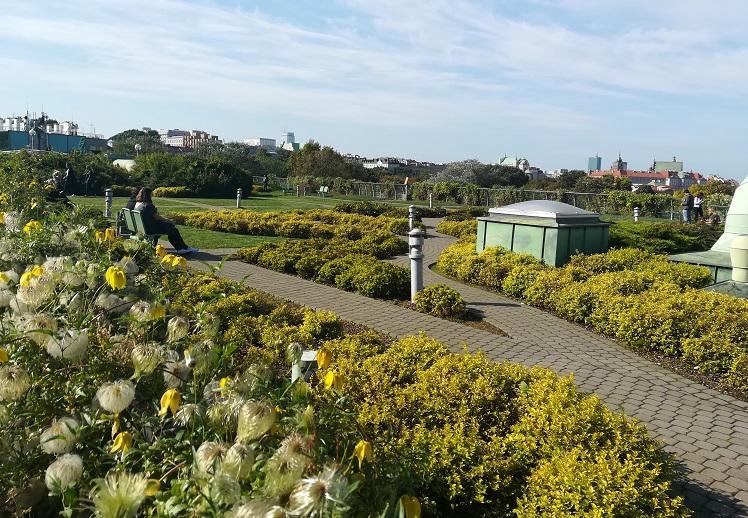 Mais la Bibliothèque de Varsovie n’est pas seulement un espace de lecture et de travail fréquenté par les étudiants ; elle constitue l’un des lieux les plus originaux de la capitale apprécié des touristes et de tout habitant Varsovie grâce à son jardin suspendu, l’un des plus grands et des plus beaux d’Europe ! Oeuvre de l’architecte paysagiste Irena Bajerska, ouvert en 2002, il se présente sur deux niveaux: une partie supérieure de 2.000 m2 et une partie basse de 15.000 m2, reliées entre elles par une rampe fleurie, un ruisseau et une cascade.