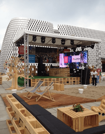 L'aspect extérieur du pavillon polonais imite l'aspect d'une cagette en bois, celle utilisée pour l'expédition des pommes et des fruits et légumes. Un énorme cube aux parois perforées qui se présente donc comme un emballage à l'intérieur duquel le visiteur est invité à découvrir l'agriculture polonaise.