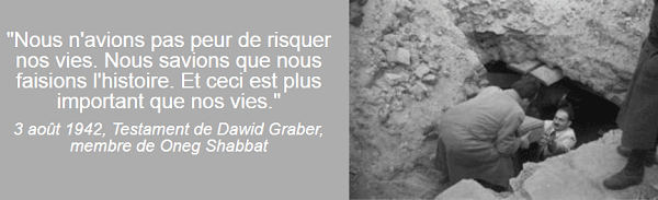 Dès septembre 1939, après l'invasion de la Pologne par l'Allemagne, l'historien juif Emanuel Ringelblum rassemble autour de lui un petit nombre d'écrivains, historiens, journalistes, professeurs et activistes. Conscients de vivre un moment grave d'histoire et désireux de pouvoir témoigner des souffrances endurées par les juifs lorsque la guerre prendra fin, ils choisissent de collecter des journaux intimes, lettres, photographies, documents officiels, articles de presse, ?uvres d'arts ayant valeur de preuves de ce qu'ils vivent. Le groupe, nommé Oneg Shabbat ? en hébreu « joie du shabbat », prescription biblique et référence à leur rencontre hebdomadaire, le samedi ? a ainsi rassemblé des milliers de documents, véritables testaments des habitants du ghetto de Varsovie. En 1942, ayant appris le début des déportations de masse vers le camp d'extermination de Treblinka, Oneg Shabbat, dont le directeur est l'un des collaborateurs les plus proches de Ringelblum, prend la décision de cacher cette précieuse collecte à l'intérieur de dix boîtes métalliques enterrées dans le sous-sol de l'école du 68 rue Nowolipki, à deux pas de l'actuelle allée Jean Paul II. De 1942 à 43, un cercle plus restreint de membres d'Oneg Shabbat poursuit le travail d'archive en se concentrant sur les informations liées à la déportation, notamment grâce au témoignage de déportés ayant réussi à s'échapper des camps. Cette collecte s'achève en 1943, et les documents ainsi rassemblés sont enterrés dans deux autres caves. Un véritable legs à la postérité, puisque quasiment aucun membre d'Oneg Shabbat ne survivra à la guerre.