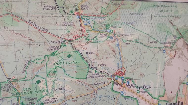 Si vous n’avez pas la possibilité d’y aller en voiture, le plus simple est peut-être de se rendre dans un premier temps à la station de métro Młociny. De là, vous êtes partis pour environ 30 minutes de bus. Il est possible de prendre le bus numéro 708 jusqu’au terminus à la station Skibińskiego 01. Vous êtes alors à l’une des entrées du parc, à Truskaw.