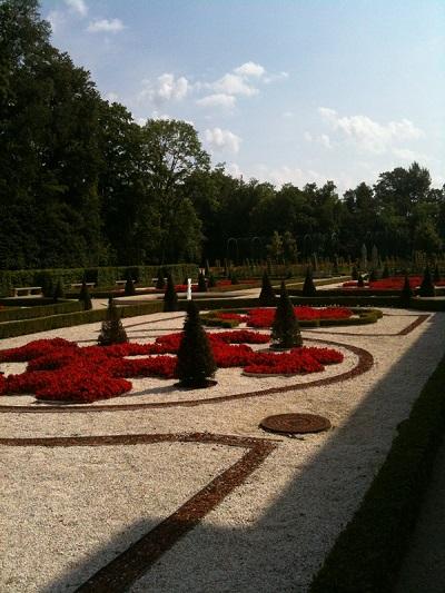 Riches en végétation, les extérieurs comportent également une roseraie, de nombreuses fontaines, et permettent d'admirer les façades extérieures du palais. Si jadis un jardin potager était destiné à nourrir les résidents du château, celui-ci, devenu obsolète, n'existe plus. Le parc du château est aujourd'hui un véritable lieu d'agrément et de promenade, à l'atmosphère calme et discrète, qui accueille des spectacles et concerts l'été et un labyrinthe illuminé en période de Noël.