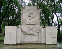 Au premier embranchement de notre chemin, un monument de calcaire nous fait face. Composé d'un bas-relief d'un côté, et d'un poème de l'autre, il commémore la mort de six soldats de l'Armée rouge (3) tués par les Nazis en Septembre 1944. Depuis son inauguration en 1946, cet édifice a été victime de nombreux actes de vandalisme tant l'Armée Rouge est impopulaire auprès des Polonais.