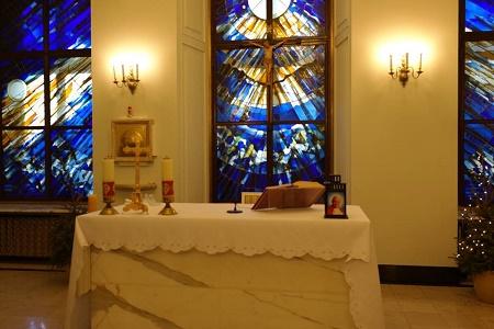 Pour clôturer la visite, un arrêt devant chapelle officielle du palais s'impose. Contrairement à la France, pays laïque, les symboles de l'Eglise et de l'Etat se confondent souvent en Pologne. Construite à la demande de Lech Walesa, elle abrite la croix de guerre d'un dignitaire retrouvée parmi les décombres de l'avion présidentiel à la suite de la catastrophe de Smolensk. Le visage bienveillant de Jean Paul II, nous contemple depuis l'autel. Cette chapelle, par la place qu'elle occupe est une étape incontournable pour tout chef d'état en visite en Pologne, avant l'entretien privé avec le président dans le petit salon qui lui fait face.