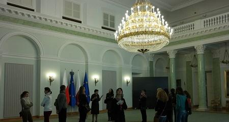 Pour y accéder, nous traversons l'antichambre (ainsi nommée en Polonais). La salle de bal est ornée d'un magnifique lustre en cristal de bohème, le premier de Pologne à fonctionner entièrement au gaz. D'une dimension légèrement inférieure à celle du palais royal (on ne saurait faire de l'ombre au roi !) son décor n'a pas été touché depuis le XVIIIe siècle, si ce n'est par les nazis, qui jugèrent bon d'ajouter des éléments en faux marbres. C'est ici que le président donne ses discours, faisant son apparition par l'une des deux portes, pour venir se placer au niveau d'un marquage, léger mais qui, grâce aux indications de notre guide, n'échappe pas au reste du groupe !