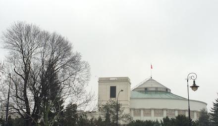 Pour cela, rendez-vous ul. Wiejska 4/6/8, où se réunissent régulièrement les députés et les sénateurs depuis 1919. Ce n'est qu'à cette date qu'un lieu fixe est déterminé pour les réunions parlementaires mais les débuts du parlementarisme en Pologne sont anciens. C'est en effet quasiment le seul pays européen où un réel pouvoir législatif est établi dès le Moyen-Âge. Pendant cette période, la Chambre des Députés, rassemblant la petite noblesse, et le Sénat, regroupant les châtelains, voïvodes et hauts dignitaires religieux, se réunissent dans des endroits variables : dans différentes villes du royaume, ou encore à cheval sur les plaines de la Wola, avant d'opter dans la dernière moitié du XVIIIème siècle pour le palais royal de Varsovie. Des réunions qui cessent ensuite pendant plus d'un siècle. En effet, justement affaiblie par le large pouvoir du Parlement qui empêche toute réforme royale avec son droit de veto, la Pologne est envahie en 1795 par ses voisins prussiens, russes et autrichiens qui se partagent son territoire. Retrouvant son indépendance à la fin de la Première Guerre mondiale, il faut trouver un siège au Parlement qui ne peut plus se réunir au palais royal du fait des destructions opérées par les troupes allemandes et de la multiplication du nombre de députés ayant plus que doublé. Le lieu choisi est l'ancienne école secondaire pour jeunes filles, située rue Wiejska, bâtiment vide et facilement adaptable par des travaux aux besoins du Parlement. Mais victime de la Seconde Guerre mondiale, le complexe de bâtiments actuel date des années 1950, reconstruit sous la direction de Bohdan Pniewski, architecte connu de Varsovie, inspiré par la Renaissance.