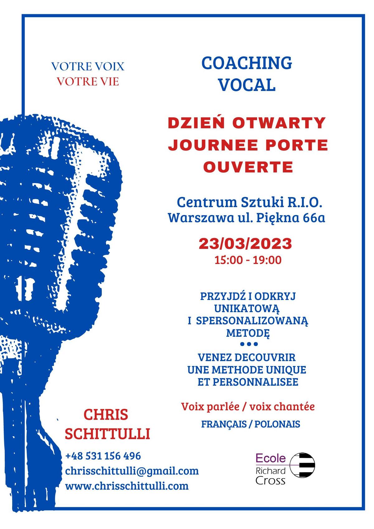 Chris Schittulli, coach vocal - voix parlée, voix chantée - méthode Richard Cross vous accueille lors de la journée Porte Ouverte le 23 mars de 15h à 19h, 66a rue Piekna à Varsovie.