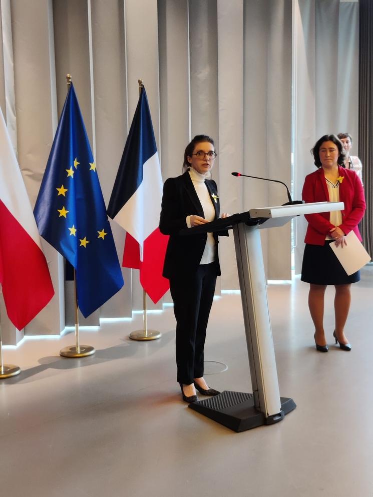 En l’absence de Monsieur l’Ambassadeur, Étienne de Poncins, c’est Lucie Stepanyan, Première conseillère de l’Ambassade de France à Varsovie qui a accueilli les convives en mettant en avant les engagements de l’ambassade dans le cadre de la « Diplomatie féministe ». Cette dernière prend chair, en interne, dans les actions de formations contre les violences dans l’espace public, pour l’inclusion et la diversité, visant ainsi une société plus égalitaire.