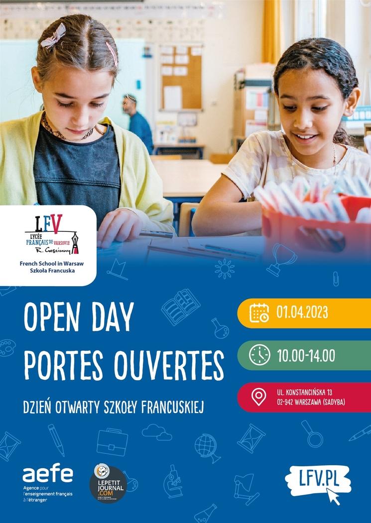 Ne manquez pas la Journée Portes Ouvertes du Lycée français de Varsovie ! Le samedi 1er avril 2023, la direction et l’équipe pédagogique de l'école primaire française seront à votre disposition pour répondre à toutes vos questions sur l’école, l’enseignement français et l’offre d'activités extrascolaires pour les enfants de 2 à 11 ans…