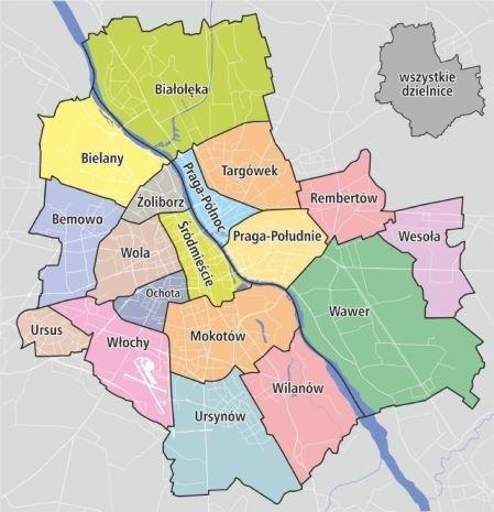 Chaque quartier a une couleur sauf Praga Północ et Śródmieście qui en ont deux. On peut regretter ce choix alors que le quartier central d’Ochota est absent et que des quartiers essentiels comme Ursynów ou Bielany, certes plus périphériques, le sont aussi.