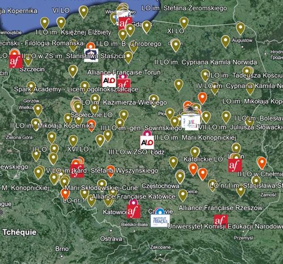 Alain Mompert, directeur de l’École Maternelle et Primaire Française (EMF) de Gydnia, en collaboration avec Ivo van Boeijen, ont créé une carte interactive permettant de savoir, grâce à une carte Google Earth, sur internet, quels établissements sur le territoire polonais proposent des cours de français.