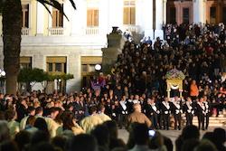 Sur la place principale de la ville, vendredi soir après l'office, chaque église sort son épitaphe, précédé de la croix de laquelle on a descendu le Christ, et entame une procession accompagnée par une fanfare qui joue un chant funèbre. Une multitude de fidèles sont présents dans un recueillement intense. Tout au long de la procession, les fidèles jettent des fleurs et parfument l'épitaphe, toujours en tenant dans leurs mains des cierges et en psalmodiant.