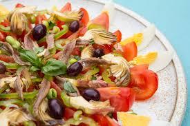 Décorer avec les anchois et les olives noires du marocaine et Faire la vinaigrette avec l'huile d'olive artisanale marocaine, poivrer et saler le tout. Certains préfèreront un simple filet d'huile d'olive avec un peu de citron.