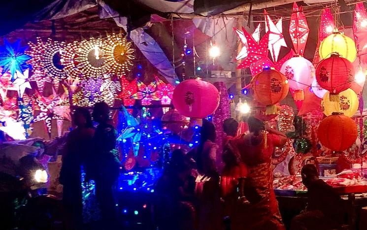 - Ici, on ne manque aucune occasion de décorer sa maison ! Les maisons sont ainsi décorées avec des guirlandes, des lumières, un sapin (faux) ou même dans certaines régions des bananiers ou des manguiers (eh bien pourquoi pas tiens ?). Les rues des régions et villes à forte population chrétienne sont aussi illuminées et on peut parfois y découvrir une crèche de Noël. Les gens s’y réunissent et dansent autour le soir du 25 décembre. Dans les grandes villes, de nombreuses vitrines sont décorées et suggèrent l’atmosphère de Noël.